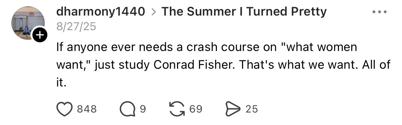 Of course, Conrad isn’t perfect, but that’s part of what makes him feel real. We watch him stumble through grief after losing Susannah and at times, his emotional pain makes him closed-off, irritable, or unsure of how to communicate what he’s going through. These struggles obviously aren’t green flags in themselves, but they matter because of how he responds to them. Instead of ignoring his pain or hiding behind bravado, we see Conrad go to therapy, learn to lean into his emotions, and put in the effort to grow.